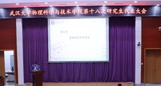 第十八次研究生代表大会在物院一楼报告厅顺利召开。参加大会的有院长徐红星院士、校团委副书记代茜老师、党委研究生工作部黄啸老师、副院长李利华老师、党委副书记张一飞老师、院学工办主任李顺彦老师及全院160余名研究生代表等。大会由2018级硕士生吴慧娟主持。