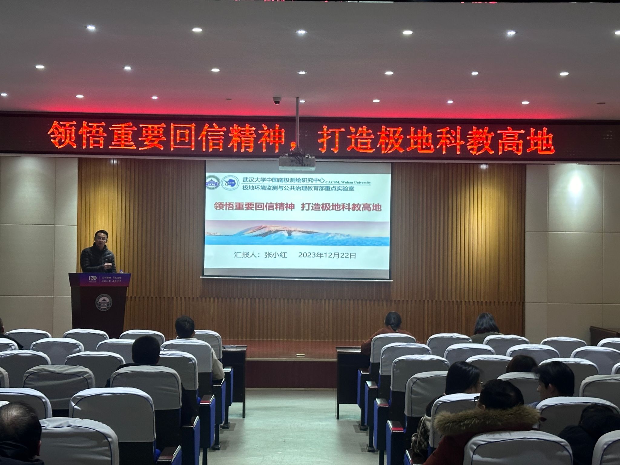 12月22日下午,物理科学与技术学院召开集中政治理论学习大会,专题学习习近平总书记给武汉大学参加南北极科学考察队师生代表的重要回信精神,会议邀请武汉大学中国南极测绘研究中心主任张小红教授分享亲身经历与精神感悟。学院全体教职工、学生党员代表参加会议,会议由学院党委书记肖湘衡主持。