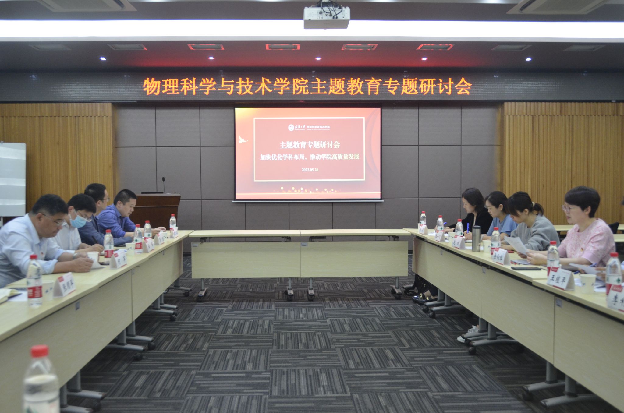 5月26日上午,物理科学与技术学院主题教育读书班召开“加快优化学科布局,推动学院高质量发展”专题研讨会,学校第二巡回指导组副组长赵妍、学院领导班子全体成员、院长助理、专项助理、各系主任参加。会议由学院党委书记余向红主持。
