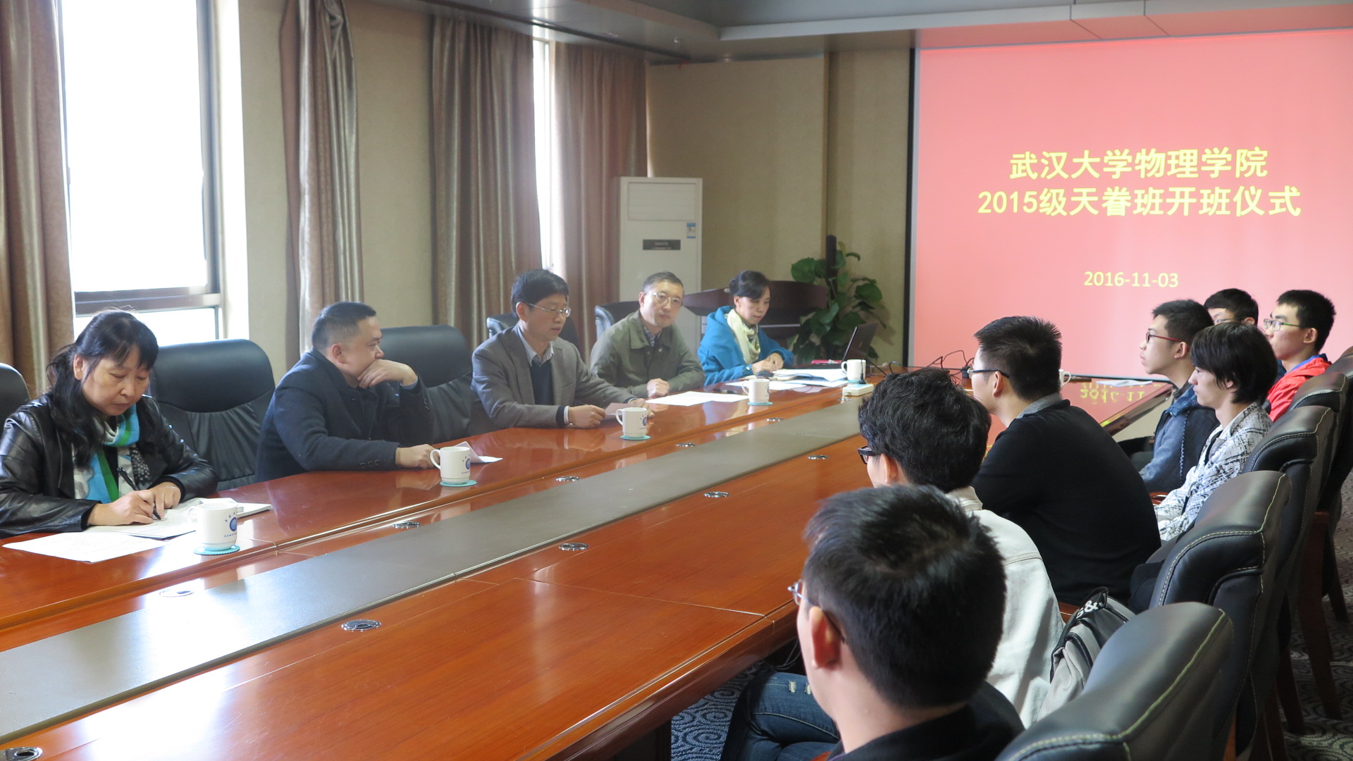 11月3日下午,武汉大学物理科学与技术学院2015级天眷班开班仪式在中科院武汉物理与数学研究所举行。武汉物理与数学研究所党委书记詹明生研究员、研究生处处长李涓、武汉大学物理科学与技术学院副院长乔豪学教授等,以及2015级天眷班全体学生参加开班仪式,武汉物理与数学研究所所长助理王谨研究员主持会议。