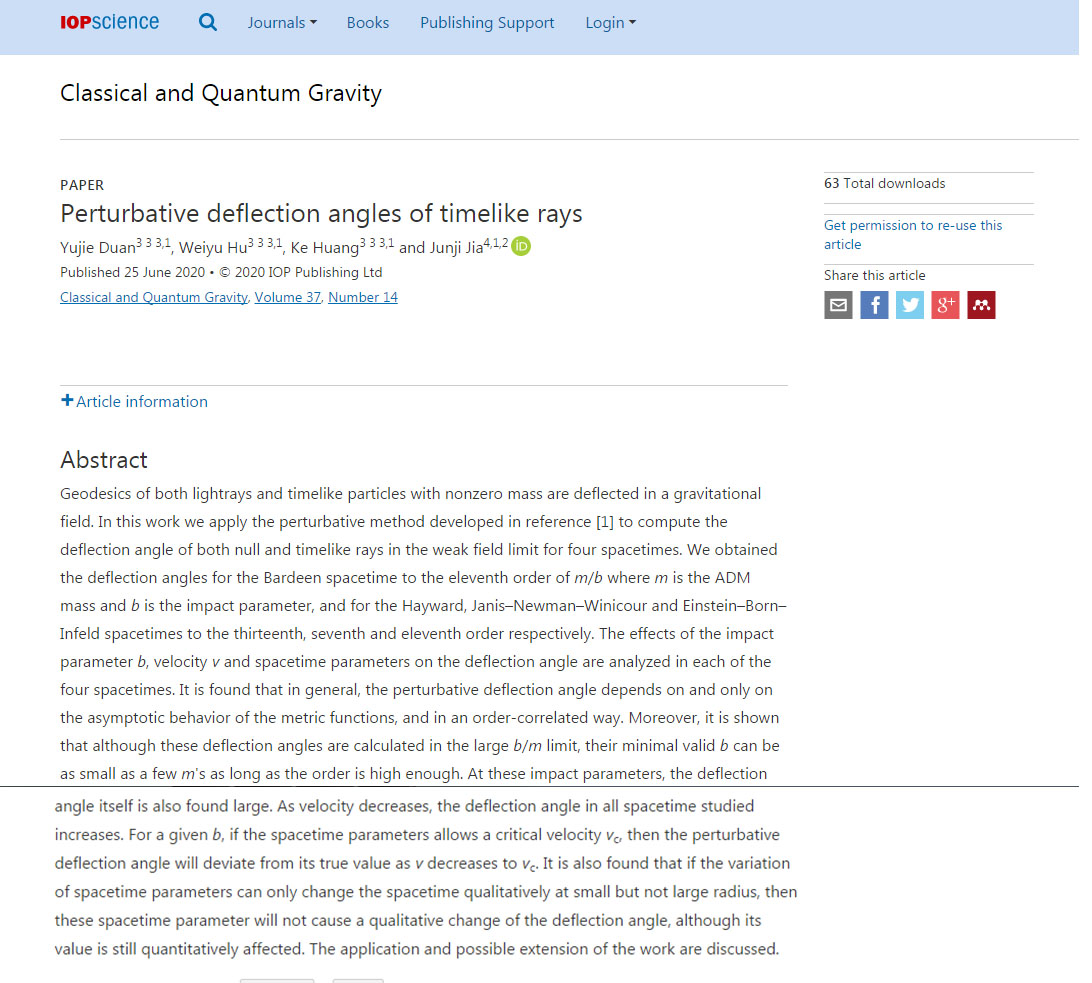 一篇论文题名为:Perturbative deflection angles of timelike rays,发表在 Classical and Quantum Gravity上。该研究论文用微扰的方法计算有质量粒子和无质量粒子在四种时空的弱引力作用下的偏折角,同时发现在微扰阶数足够高时, 这种方法在一定的强引力范围内也是有效的。研究在中途遇到了一些困难,如发现在度规函数很复杂时, 其计算效率非常低。但黄可同学发现偏折角只依赖于度规函数的渐近行为, 可以先将度规函数展开再计算偏折角。“虽然这个工作本身比较基础, 但是我学到了关于写论文的很多知识, 还有关于发表的步骤”,黄可同学说到。