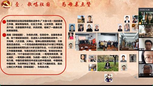首先支部书记传述了国家新冠肺炎的防控工作。在疫情防控这场没有硝烟的战争中,广大奋斗在一线的医务工作者、解放军指导员、社区工作者、公安民警、基层党员干部、志愿者携手并进,共克时艰,唱响了一曲曲壮美的英雄赞歌。在防控中,全国各条战线、各个领域紧急防控,迅速投入没有硝烟的战争中。一方有难,八方支援。火神山,雷神山医院拔地而起;方舱医院迅速启动,一个月完成的病床数相当于60家三甲医院。来自全国各地和军队的330多支医疗队伍、4.6万多名医务工作者星夜驰援,与湖北和武汉并肩作战。各地纷纷伸出援助之手,19个省份进行对口支援;一笔笔特殊党费、爱心捐款,一笔笔爱心捐赠,为战疫一线投入了必胜的信心和力量。中国在疫情防控中迸发出的中国速度、中国规模、中国效率,为世界树立了典范,彰显了大国的担当,因此让我们大声高唱《歌唱祖国》,为母亲点赞。