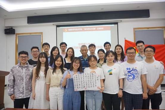 彭教授从大学毕业的工作安排讲到了我国第一颗原子弹氢弹的研制过程,期间经历的种种艰辛,彭教授讲起不由得感慨万千,感慨当年一批富有情怀的青年志士于荒凉之处开天辟地,感慨共和国取得今天成就的来之不易。谈及一生为之奋斗的加速器,彭教授面对黑板,激动的给大家讲起了研制过程和工作原理,虽然年过八旬,彭教授依然精神矍铄,思维敏捷,尽显大师风采,课题组的同学们全神贯注,享受知识的饕餮盛宴。课后,彭老师赠予支部一副墨宝,寄托对青年人参与国家复兴的期待。