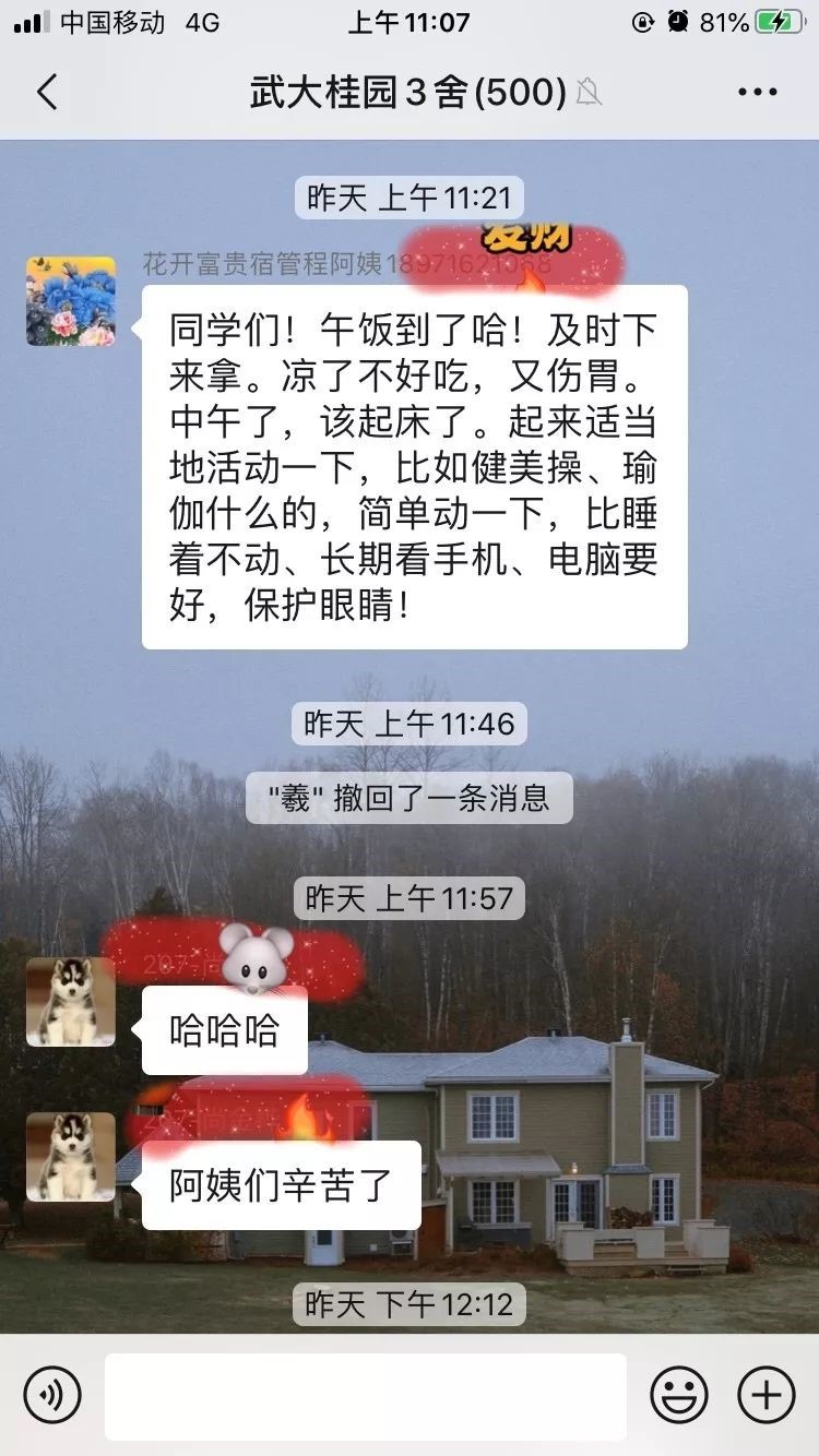 特殊时期的留校生活似乎和平时也差别不大,学校尽最大努力为留校学生提供便利,例如超市成立留校生服务群,可以每日在群里下单,超市人员根据地址派送,宿管阿姨每天在群里提醒大家注意身体,适当做一些运动。