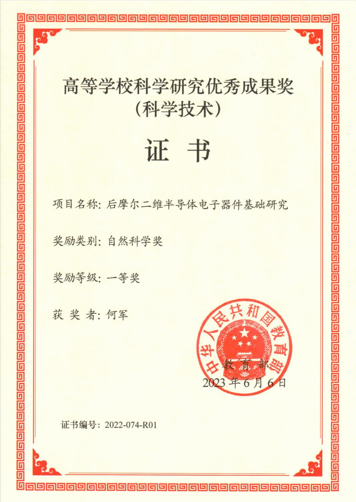 近日,教育部颁发了高等学校科学研究优秀成果奖(科学技术)获奖证书,武汉大学物理科学与技术学院何军教授团队牵头完成的“后摩尔二维半导体电子器件基础研究”项目,荣获2022年度教育部高等学校科学研究优秀成果奖(科学技术)——自然科学奖一等奖。
