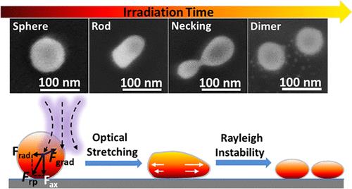 在国家自然科学基金以及中央高校基本科研业务费专项资金的资助下,我院光子材料与技术课题组(PMT)的研究人员在利用激光辐照金纳米颗粒导致其熔融的同时,利用光学力的协同作用,使近球形的金纳米颗粒发生拉伸变成纳米棒最终断裂得到二联体(图1)。其成功的关键在于基底对纳米颗粒的粘滞作用,以及合适的温度(辐照功率)让金纳米颗粒发生软化,光学力才能够克服粘滞阻力对金颗粒产生拉伸作用。通过对温度以及光学力的模拟,他们发现梯度力以及光压力的水平分量对于金颗粒的拉伸起到主要作用。这一发现为纳米颗粒形貌的光学调控提供了一种新手段。