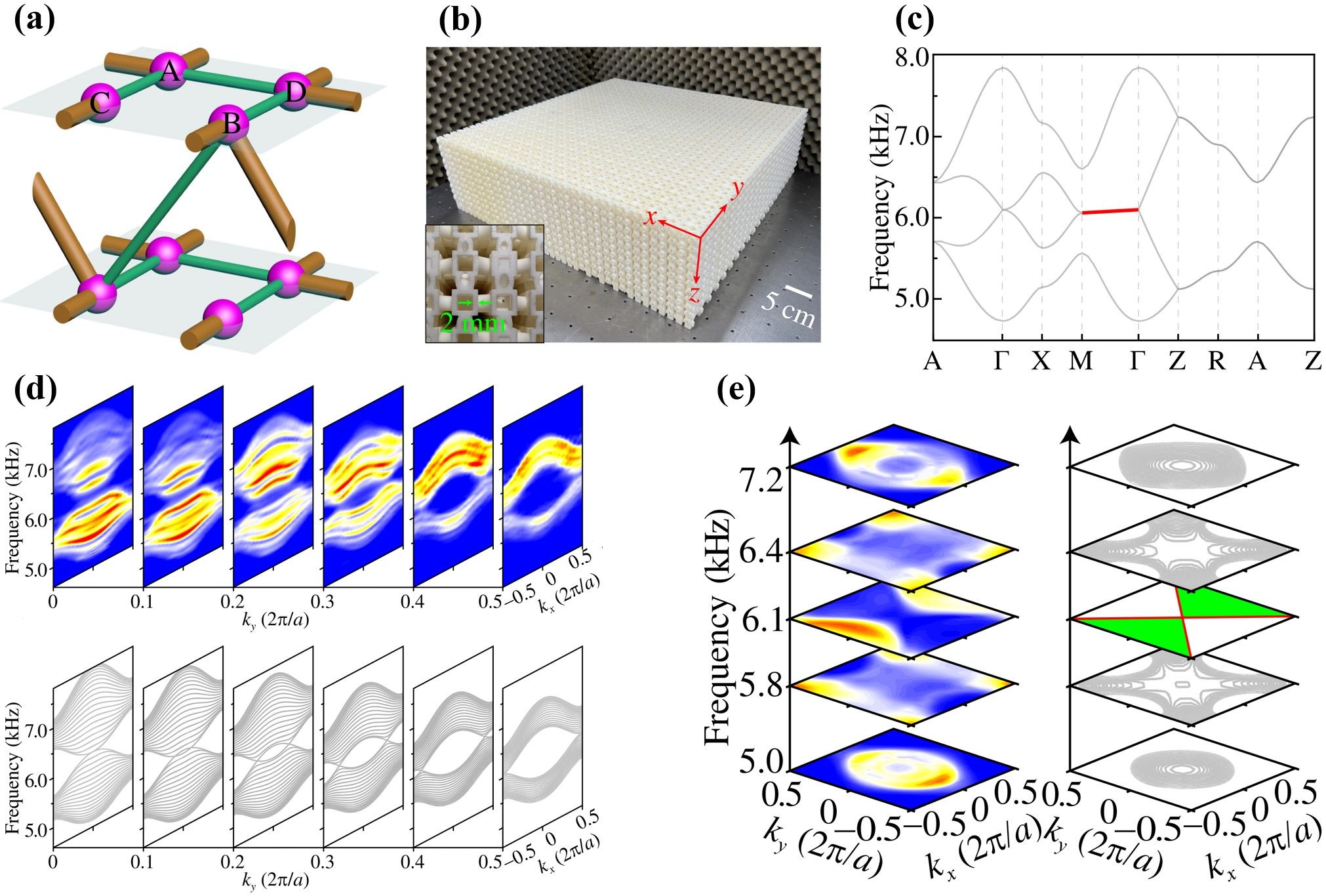 图一:(a)高阶节线半金属的模型;(b)用于测量二维投影体带结构和鼓膜表面态的声子晶体样品;(c)声子晶体的体带结构;(d)测量和仿真的二维投影体带结构对比;(e)测量和仿真的鼓膜表面态对比。