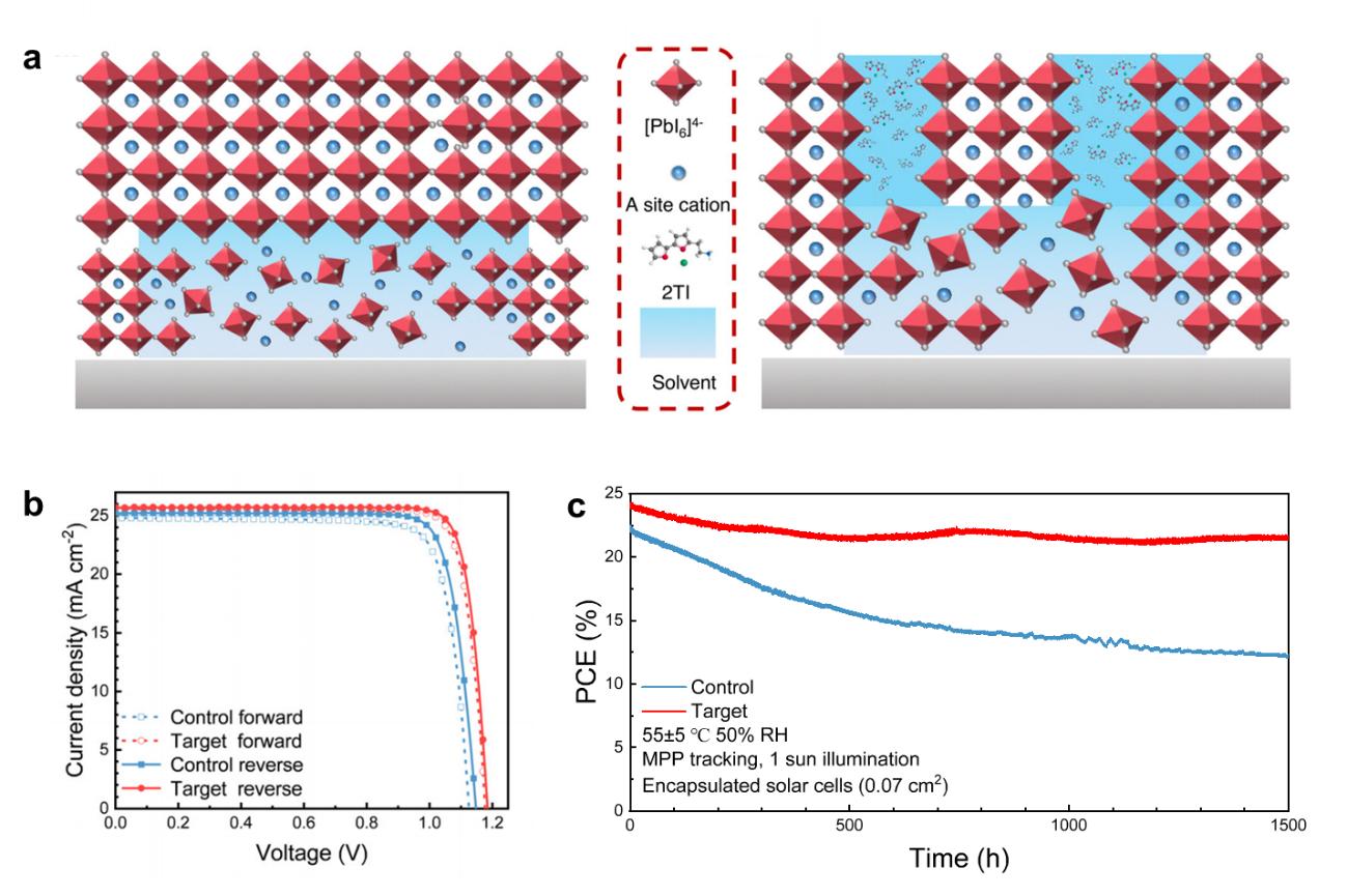 本研究发现,传统的结晶过程会在钙钛矿薄膜的垂直方向上产生显著的应力不均,从而降低电荷传输能力,影响器件的电性能和长期稳定性。通过原位光致发光(PL)研究,我们揭示了这种不均匀应力与薄膜自上而下的结晶方式密切相关。为解决这一问题,我们引入少量2-([2,2'-联噻吩]-5-基)乙胺碘化物(2TI),调控钙钛矿的结晶过程。该分子可与薄膜表面的铅-碘八面体结合,引导更均匀的自上而下结晶,从而减少垂直方向的应力不均,优化能带结构,提高电荷传输效率。最终,该方法显著提升了基于甲脒-铯(FA-Cs)的PSCs的电性能,同时改善了其效率和长期稳定性。
