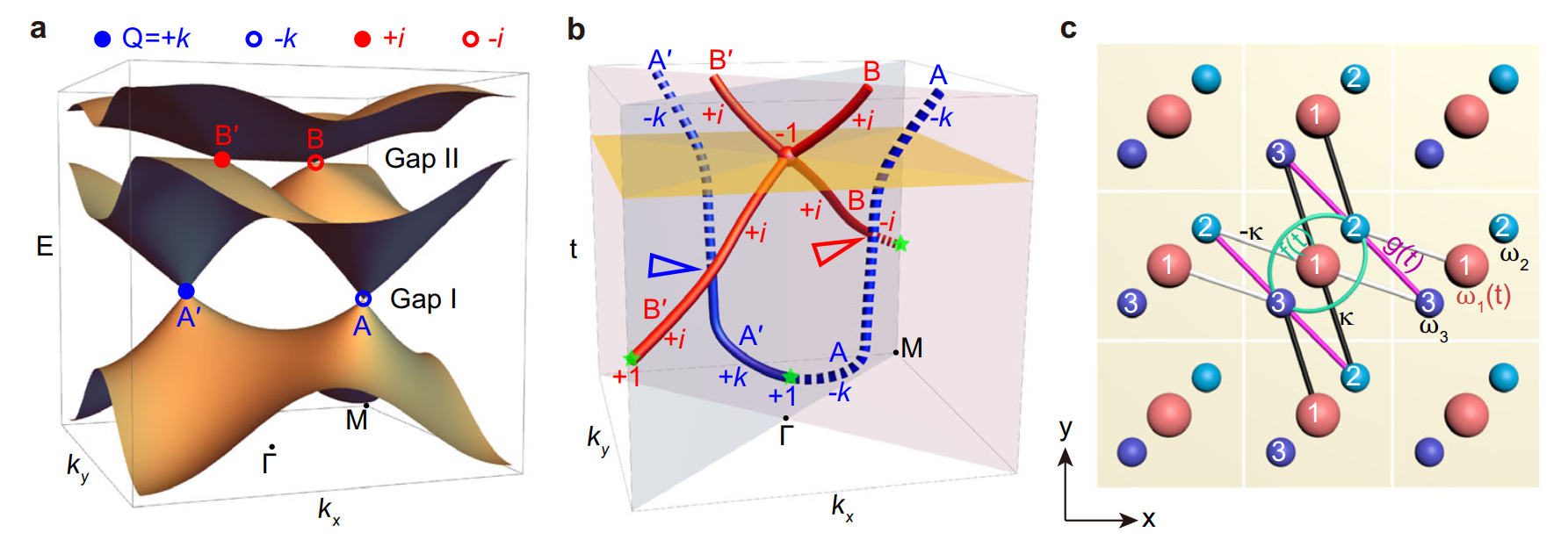 图1:最简非阿贝尔节点编织模型。(a)具有两对能带节点的三带示意图。(b)能带节点(实线和虚线)的时间演化,包括它们的产生(绿色五角星处)、编织(彩色三角形处)、碰撞(黄色平面处)和反弹。(c)紧束缚模型。