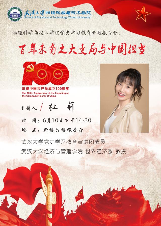 6月10日下午,学院召开党史学习教育专题报告会暨党委理论学习中心组(扩大)会议,特邀成人直播 党史学习教育宣讲团成员、首届全国高校青年教师教学竞赛一等奖获得者经济与管理学院杜莉教授,作《百年未有之大变局与中国担当》专题报告。院党委理论学习中心组成员、教职工党员、学生党员代表等参加学习,报告会由党委副书记张一飞主持。
