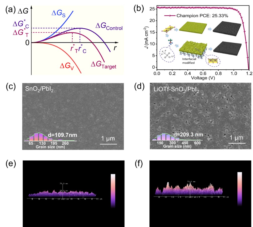 在这项研究中,研究者们发现应力主导的表面弹性势作为比表面能的组成部分,影响了碘化铅成核的临界表面吉布斯自由能与临界成核半径。而后通过在碘化铅下界面引入三氟甲磺酸锂(LiOTf)的界面工程,释放了拉伸应力,从而降低了碘化铅的成核势垒与临界成核半径,诱使大晶粒碘化铅纵向的疏松堆积,形成更高结晶质量的钙钛矿薄膜;改良后的界面还具有更低的缺陷态密度,抑制了载流子的非辐射复合,利于电子向透明电极方向的抽取与输运;基于此,单结正置钙钛矿太阳能电池获得了显著提升的开路电压、填充因子和光电转换效率。