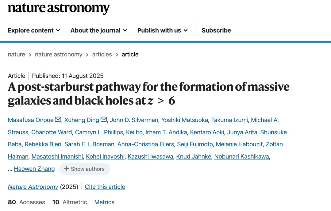 近日,成人直播 丁旭恒教授作为共同通讯作者(1/2),在高红移类星体宿主星系及超大质量黑洞快速共演研究领域取得了突破性进展,其成果发表于《Nature Astronomy》。该论文题为“A Post-Starburst Pathway for the Formation of Massive Galaxies and Black Holes at z > 6”。本项目由成人直播 和东京大学等国际合作团队联合完成。