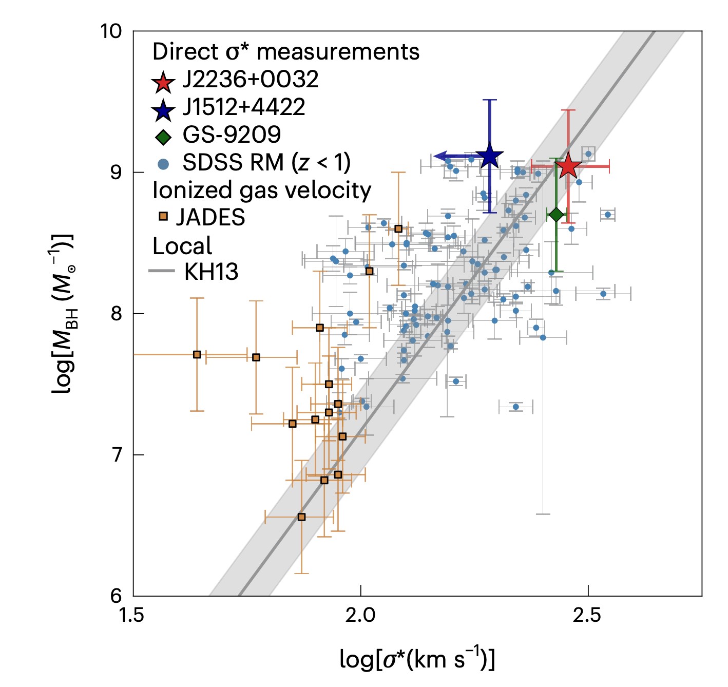 更为重要的是,两颗星系中心的超大质量黑洞仍在活跃地吸积物质,其黑洞质量与宿主星系恒星质量之比已与现代宇宙中的经验关系相近。不同于部分理论模型预测的先有星系后有黑洞的阶段性演化,这可能意味着黑洞-星系“同步成长”的关联性在宇宙极早期就已确立。此外,团队在星系光谱中观测到[O III]发射线蓝移、宽展等标志性特征,指示类星体活动驱动的核区气体外流可能是扼杀大规模恒星形成、促使星系快速“淬火”的重要机制之一。该工作还首次使用巴耳末吸收线对高红移类星体宿主星系的恒星速度弥散量(σ*)进行直接测量,J2236+0032符合当前的星系-黑洞的质量-速度弥散关系,J1512+4422则略超当前观测到的关系,为理解早期宇宙黑洞与星系共演建立起关键的观测基线。